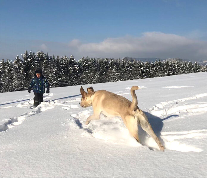 In seiner Freizeit genießt er es auch sehr mit Enkerl Kevin zu spielen. Ca. alle 4-5 Wochen fahren wir nach wie vor zum Hundeschwimmen ( www.eckhansl.at ). Er ist zu 99% immer an meiner Seite, bin ich einmal kurz alleine im Dorf fragen mich sofort die Leute „wo ist Arthur heute?“.