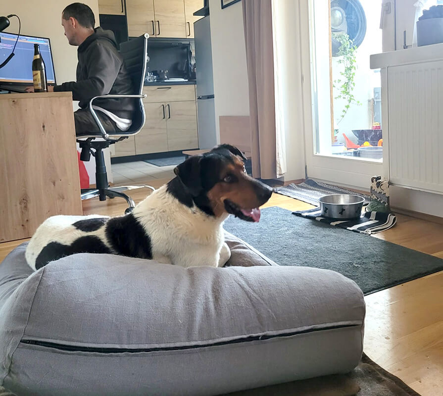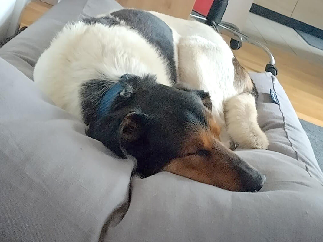 Auf einer Angstskala von 0-10, wobei 0= nix und 10= Todesangst ist,  ist er irgendwo zwischen 2 und 3. Also so gut wie gar nichts. Er hat die Wohnung in Besitz genommen. Hat sich ohne zeigen oder so seinen Platz eingenommen, wo er entspannt und ruhig tief schnarchend schläft.  Er geht super gut an der Leine. Ohne Ziehen. Ohne Stress. Also Spazierengehen ist null Problem. Ja, er erschrickt ganz kurz bei neuen Reizen (Scatern, lauten Motorrädern,  lauten Sirenen von Polizei oder Rettung Highheels, ...) und er ist urlustig. Er lässt sich streicheln und lernt buchstäblich stündlich dazu.  Er ist soviel leichter zu handeln, als wie uns jemals vorgestellt haben. Er ist ein viel einfacherer Hund, als man in der Tierstation in Ungarn jemals glauben hätte können.