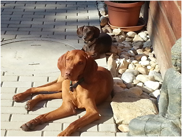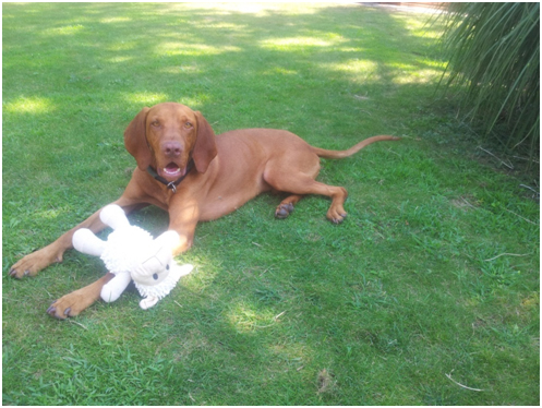 Am nächsten Tag besuchten wir das Sommerfest von Animal Care und durften Carol Byers kennenlernen. Sie war so lieb und stellte sofort einen Kontakt zum Tierheim in Ungarn her und es war klar dieser junge Rüde wird am Samstag unser sein. Der Tag der unser Leben verändern sollte. Also brachen wir am 13.07.2013 im Konvoy Richtung Ungarn auf. Nach 90 minütiger Fahrt waren wir in einem Park angekommen. Dort warteten bereits einige Hunde auf uns. Ein sehr aufgeregter Rüde und sehr aufgeregte Menschen sollten einander begegnen. Zum Glück war der Erstkontakt auch mit meiner Hündin Dana problemlos. Dieser entzückende Rüde sollte August heißen, denn wenn man ihn beobachtet weiß man dass dieser liebenswerte manchmal sehr tollpatschige Hund nur „Gusti“ heißen konnte. Wir haben ihn sofort in unser Herz geschlossen und es war klar: August hat eine neue Familie. Schutzvertrag wurde sofort unterschrieben, wir wollten nur nach Hause und in einer entspannten Atmosphäre den Neuankömmling kennenlernen. Die Autofahrt verlief ohne Vorkommnisse. August hat sich sofort wohl gefühlt.