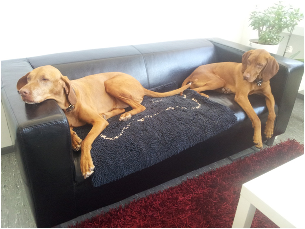 Die nächsten Tage ... August sollte all unser Hundefreunde kennenlernen und von Anfang an soziale Kontakte haben dürfen. Alle Begegnungen verliefen ohne Probleme. August ist ein sehr friedlicher Zeitgenosse. Auch sollte er den „Arbeitsalltag“ von Anfang an kennenlernen. Also durfte auch er mit ins Büro. Ein Büroalltag ist für unsere Hunde sehr lustig. Hier tummeln sich in guten Zeiten 6 verschiedene Hunderassen und Größen. Es war zu Beginn sehr spannend all das kennenzulernen. Da August kaum Muskeln und keine Kondition hatte, aber von Beginn an ausreichend bewegt wurde, verbrachte er gemeinsam mit Dana die meiste Zeit mit schlafen. Sehr angenehm um in Ruhe arbeiten zu können ;-)
