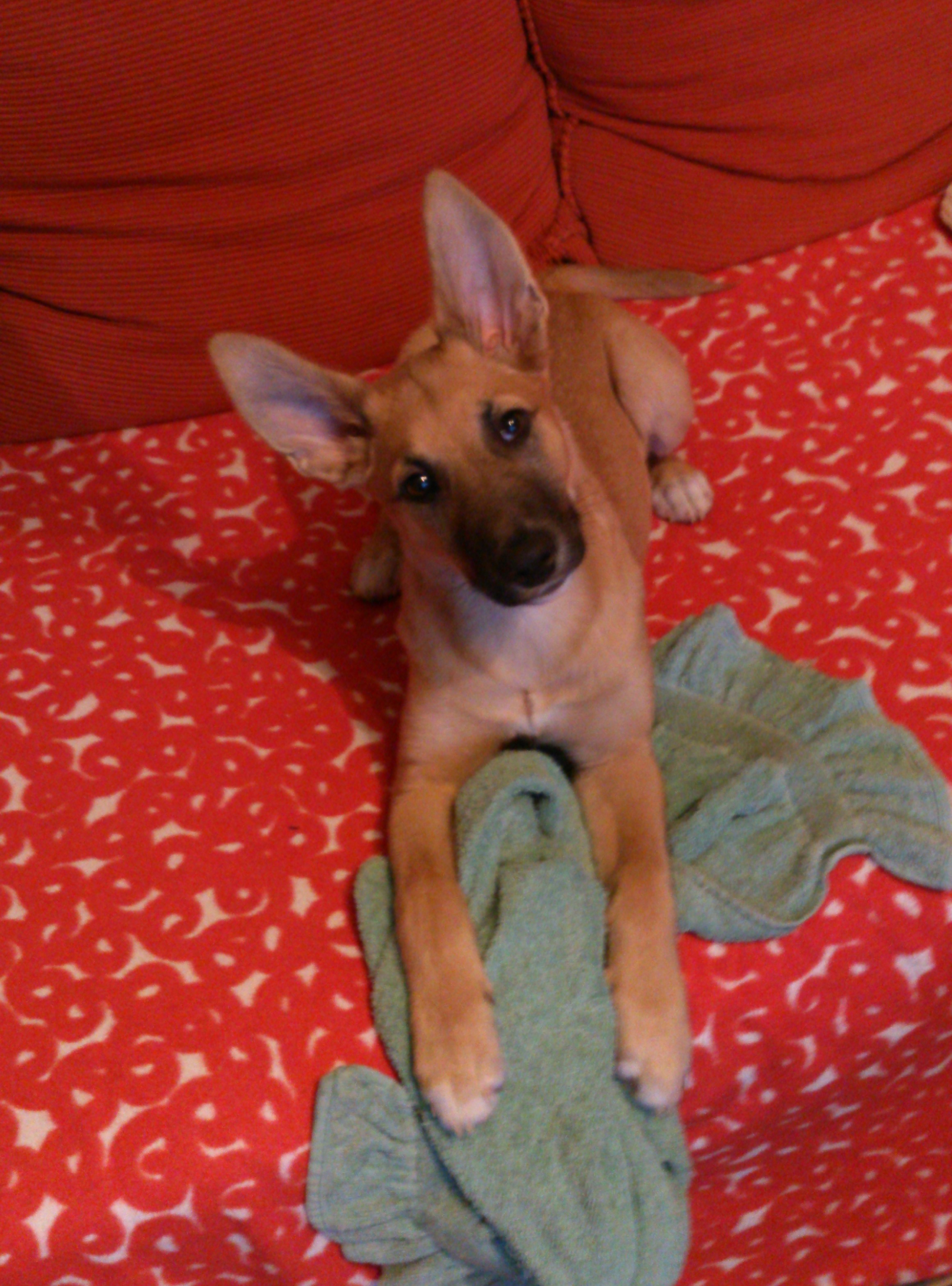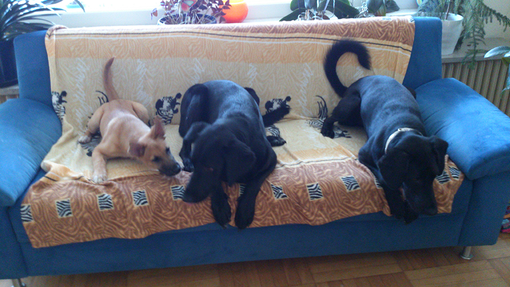 Wie versprochen sende ich dir wieder ein paar Fotos, damit du Azzurras Entwicklung siehst. Mittlerweile hat sie schon fast 10 kg und eine Schulterhöhe von 45cm, ihren ersten Zahn hat sie auch schon verloren und sie hat nun auch schon Stehohren :) Da sie schon so ein Energiebündel geworden ist, nimm ich sie jetzt auch schon regelmäßig mit zu meinem Pferd, welcher ihr "neuer großer Freund" geworden ist, welchem sie nicht mehr von der Seite weicht. Im Reitstall kann sie sich so richtig, das Beste ist natürlich, dass im Stall immer ein Hund ist mit dem sie spielen kann. Mit den Hunden von meinen Schwiegereltern versteht sie sich prima, meistens spielen sie dann zu dritt und bauen somit das ganze Haus um. :) Azzurra ist extrem klug und lernwillig, sie kann schon fast alle Grundkomandos und sogar ein paar Kunststücke, am liebsten jedoch hat sie die Denkspiele, wo sie Hütchen rausheben und Platten verschieben muss um an die Leckerlies zu kommen. Alles in Allem ist sie ein kleiner Wirbelwind, die weiß, wie sie uns auf Trab hält, aber auch gaaaanz genau weiß, wie sie uns um den Finger wickelt :)