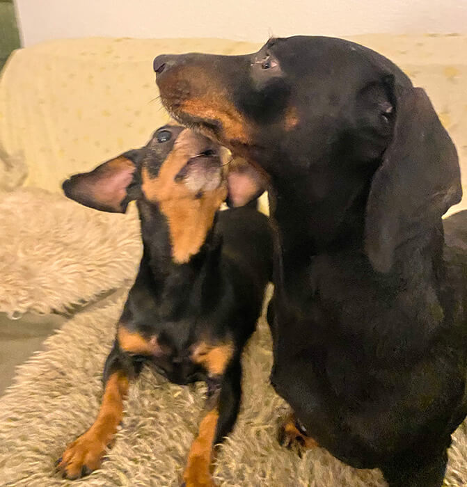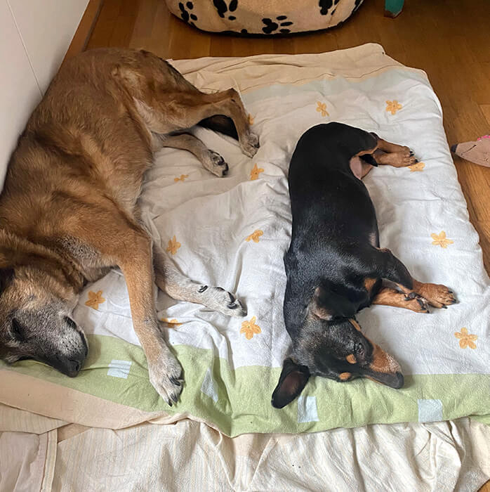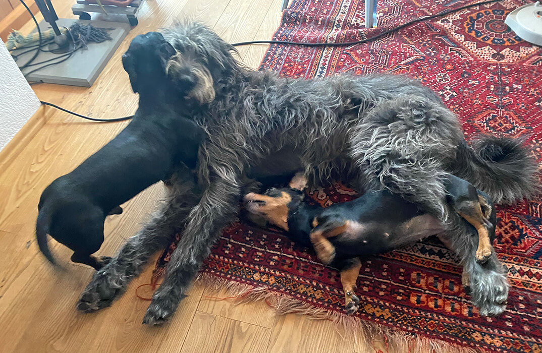 Die Hunde spielen so lieb miteinander, fressen alle nebeneinander, gehen nebeneinander an der Leine. Mittlerweile ist sie im Freien sogar schon abrufbar und auch stubenrein. Sie kuschelt am Sofa mit uns und verteidigt das Haus. Also besser könnte es nicht gehen.