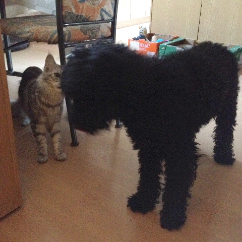 Mit den Katzen kommt er wunderbar klar. Meine Katzen sind ja so einen schwarzen Wuschel als Hund gewöhnt, und so hat es sie überhaupt nicht verwundert, dass da wieder einer ist. Der Hund hat sich vollkommen neutral verhalten und so hat es gar nicht lange gedauert, bis er zusammen mit den Katzen im Vorzimmer gelegen ist. Sogar meine ganz scheue Katze mag ihn und liegt bei ihm.