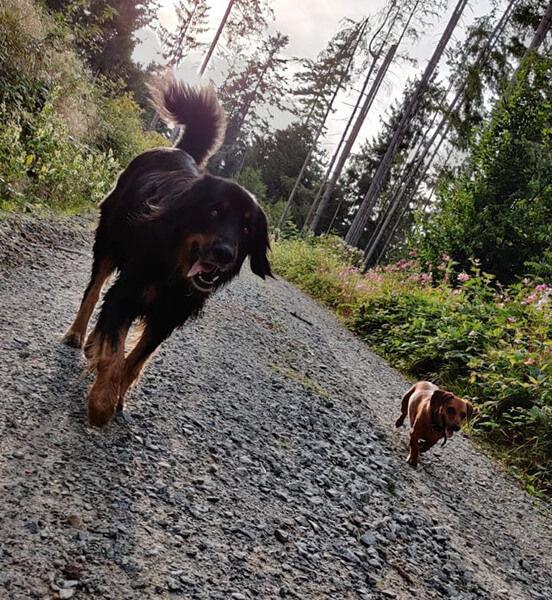 Er hat sich schnell eingelebt und uns als seine Hundeeltern adoptiert. Er liebt Kontaktliegen mit uns auf "seiner" Couch genauso sehr wie lange Spaziergänge in der Natur. Auch mit der Hündin meiner Eltern hat Bazi - trotz des fast absurden Größenunterschieds - eine gute Zeit, wie man auf dem Foto sehen kann.