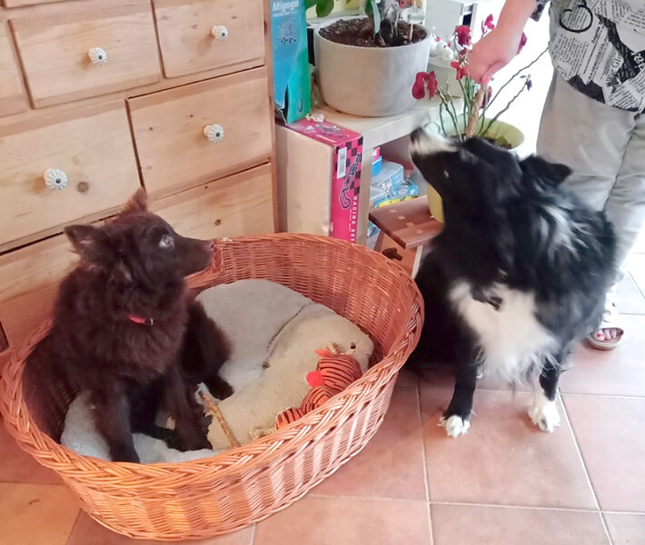 Von unserem Senior Robby lernt er sehr schnell und die beiden spielen im Garten gemeinsam. Wenn er sein Geschäft verrichten muss, zeigt er es an, indem er zur Tür läuft und sich davor setzt wie unser Robby.