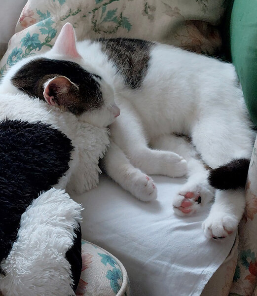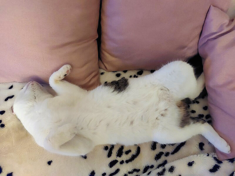 Sie liegt gerne bei mir im Bett. Ich bekomme da eine Tretmassage, Stups-Bussis ins Gesicht und Liebesbisse in Zehen und Finger.