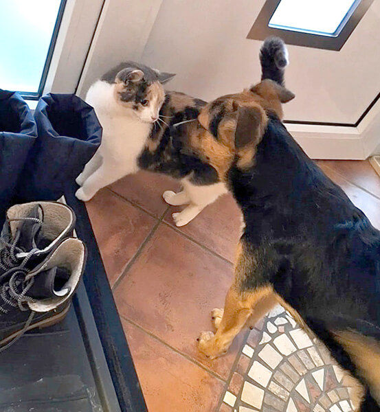 Mit seiner lieben und neugierigen Art hat er gleich jeden um den Finger gewickelt, ein paar Hundefreunde gefunden und auch unsere Katze Finya mag ihn immer mehr.