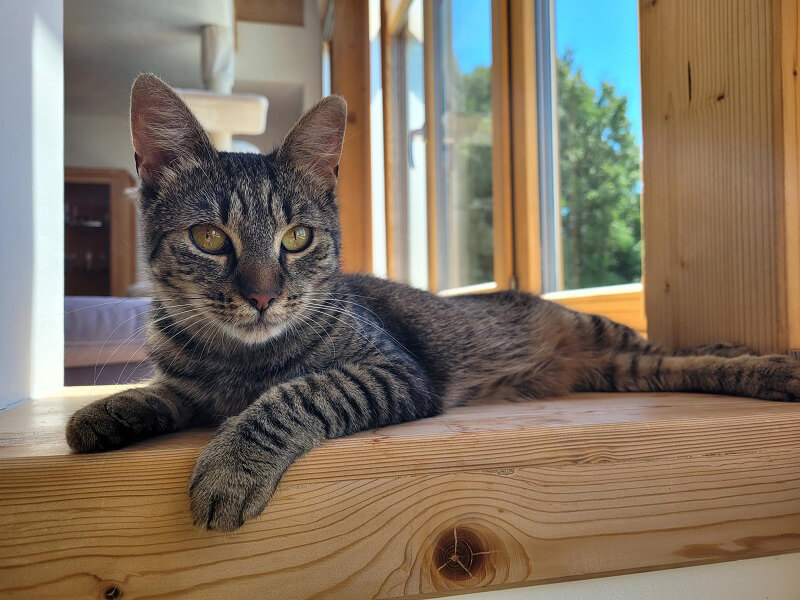 Erni hat sofort nach ihrer Ankunft das gesamte Haus erkundet. Cosmo hat etwas länger gebraucht und ist einmal zwei Stunden hinter einer Kabeltrommel im Regal gesessen, bevor auch er gemeinsam mit Erni einen Streifzug durchs Haus unternommen hat.