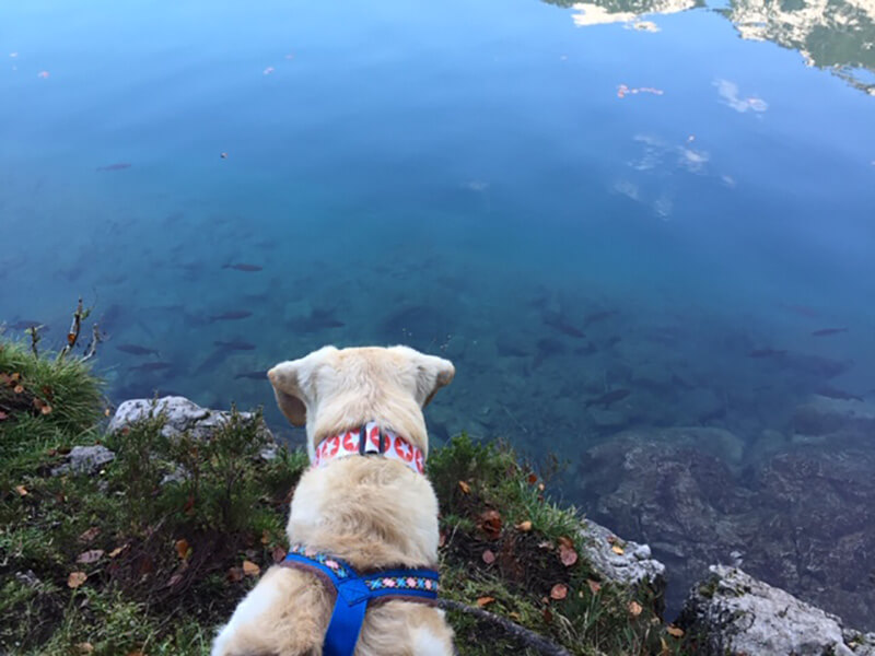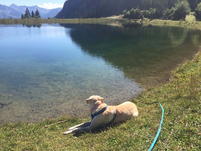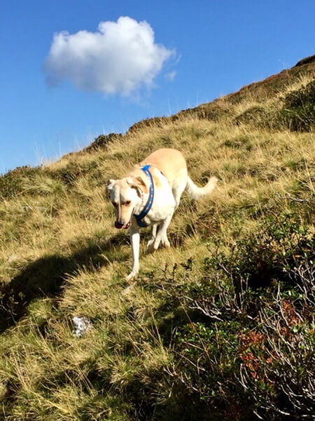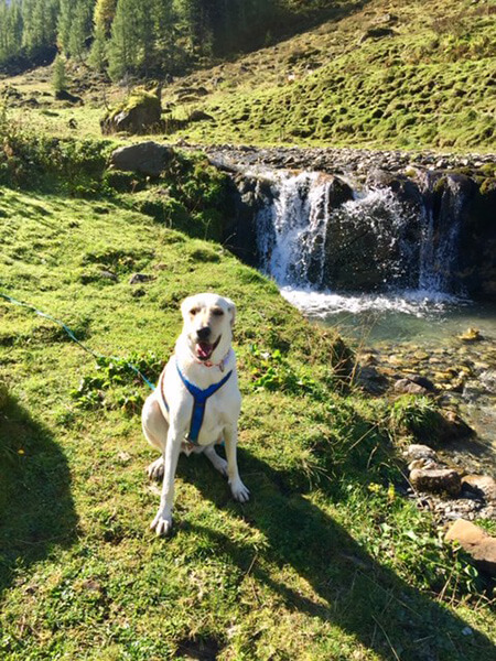 Erik hat sich sehr gut gemacht, v.a. der Urlaub in den Bergen hat ihm sehr gut getan. Wir waren viel wandern und er hat sich als großartiger Wanderbegleiter gezeigt. Obwohl er sonst eher gemütlich ist, haben ihm die langen Wanderungen sehr gut gefallen und v.a. auf den Hütten war er sehr gerne, weil er jedesmal Frankfurter spendiert bekam. Er geht immer noch nicht freiwillig ins Auto, aber er wehrt sich nicht mehr dagegen in den Kofferraum verfrachtet zu werden. Ich hebe ihm die Vorderpfoten rein und er zieht dann sein Hinterteil mehr oder weniger alleine nach.