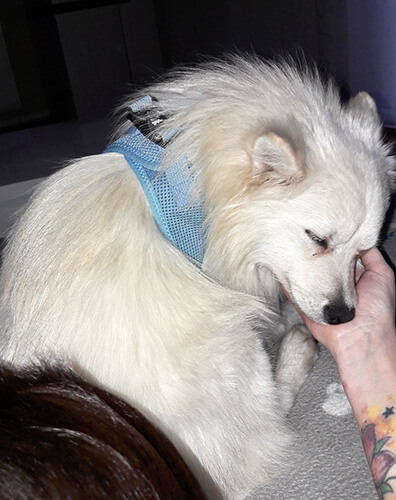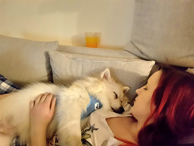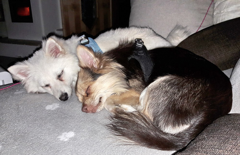 Mit unserem Buddy hat er sich von Anfang an gut verstanden. Eskimo liebt es zu kuscheln und ist dankbar über jede Streicheleinheit.