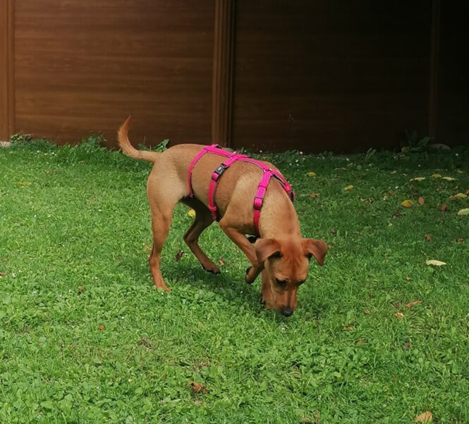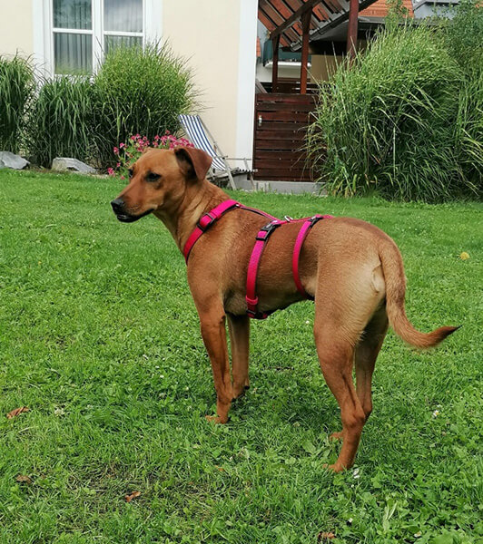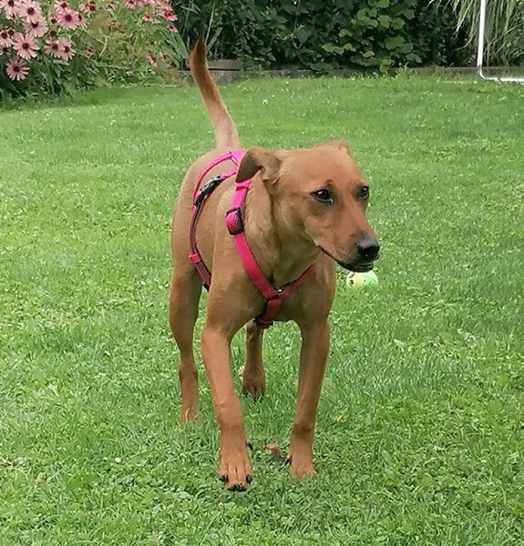 Im Garten tollt Fay schon ganz entspannt mit Mia und mir umher. Spazieren gehen ist nicht so ihres.