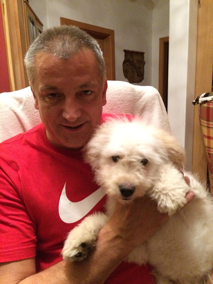 Floppy ist vom Wesen her absolut entzückend, ist sehr verspielt und absolut verschmust. ER hört bereits auf gut auf seinen Namen und auf die Befehle “Sitz” und auf “Komm” ist noch sehr stark auf mich fixiert, aber der nun tägliche Kontakt zu meinen Eltern und den vielen Spaziergängen lockert dies schon ein wenig. Hungrig ist er immer - wie ein kleiner Wolf und nächtens schläft er immer ganz brav in seinem Körbchen im Wohnzimmer und freut sich jeden Tag, bis es endlich Morgen wird und ich mit ihm spielen kann.