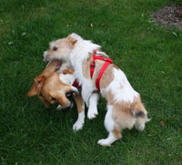 Hiermit sende ich Ihnen 4 Fotos von Flora mit Freundin Lady im Garten.