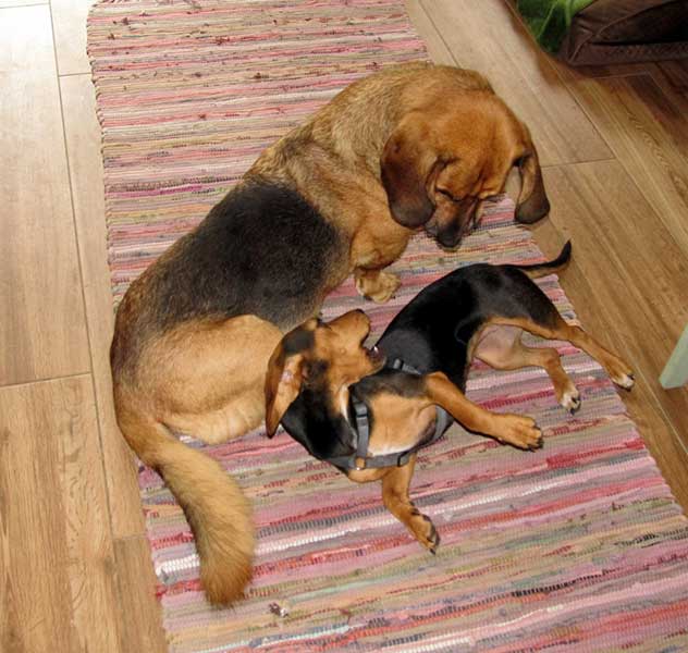 Unserer älterer Rüde (14 Jahre) hat einige Tage gebraucht, um sich an sie zu gewöhnen, weil sie sehr quirlig ist, aber sie hat mittlerweile auch verstanden, dass er nicht mehr spielen möchte. Unser zweiter Rüde (9 Jahre) hingegen ist überglücklich, nun eine Spielgefährtin zu haben. Sie jagen und raufen mit Freude, liegen zum Teil sogar in einem Bettchen.