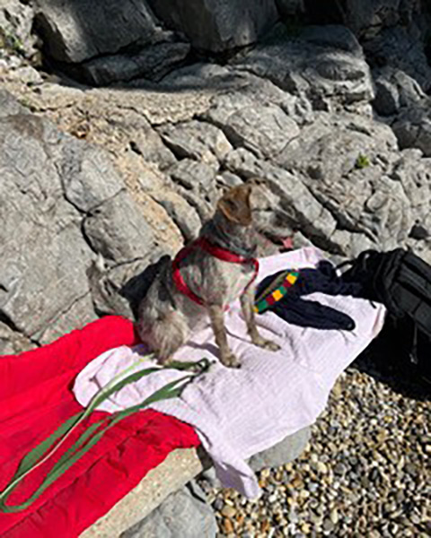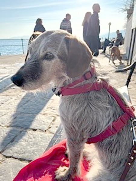 Flora ist so eine wunderbare Hündin, so eine kluge, feine Persönlichkeit hat sie. Ich kann mir einfach gar nicht vorstellen, wie so ein toller Hund in den Tierschutz kommen konnte: sie geht so brav an der Leine, braucht im Grunde gar keine Kommandos, weil sie alles weiß, was notwendig ist. Ich habe sie von Anfang an überall mitgenommen und so hat sie sich rasch an den Alltag gewöhnt. Einmal in der Woche fahren wir mit dem Zug nach Wien, sie liebt das Zugfahren, da schläft sie neben mir ganz entspannt. Wir sind jetzt zum zweiten Mal auf Urlaub in Opatija. Das erste Mal Ende September: da bin ich draufgekommen, dass sie das Meer so liebt. In Ö waren wir öfter am Traunsee, auch da: Wellenrauschen und sie ist komplett ekstatisch.