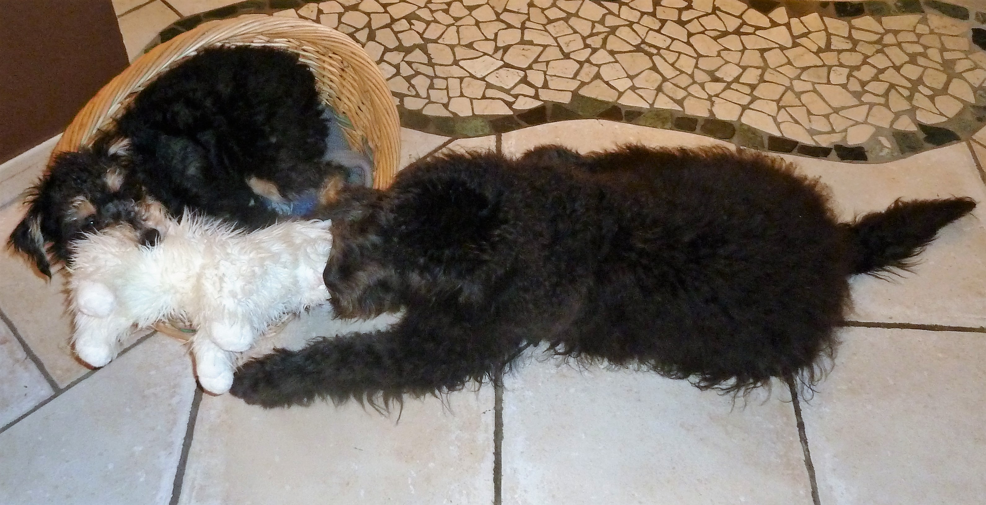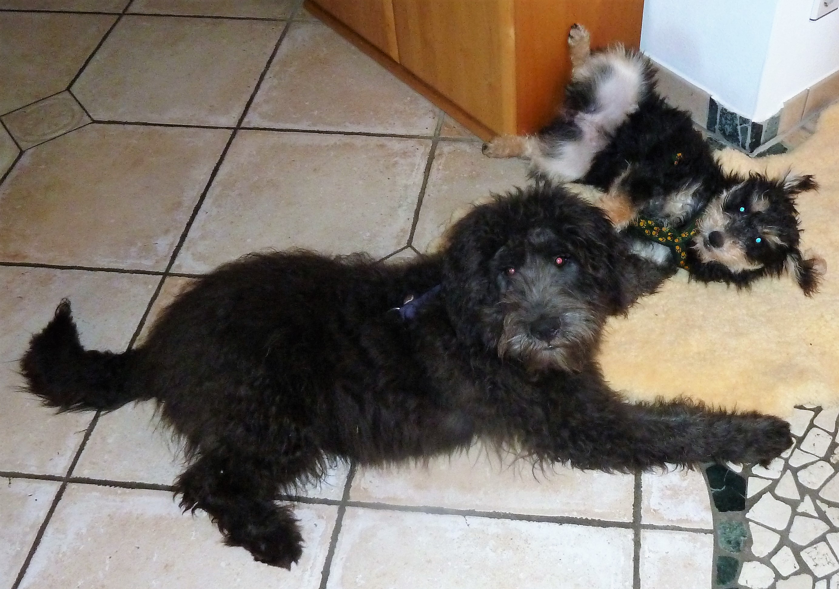 danke für das Foto! Im Anhang schicken wir Ihnen ein paar Schnappschüsse von Fluffy und Scarlett. Die beiden entwickeln sich prächtig! Scarlett ist einfach ein Sonnenschein und Fluffy wird von Tag zu Tag mutiger! Wir haben eine liebe Freundin, die Hundetrainerin ist, und die mit uns arbeitet und uns wertvolle Tipps gibt. Fluffy ist zu Hause überhaupt nicht mehr ängstlich, sondern entwickelt sich schon zu einem echten Beschützer, wenn es z.B. an der Tür klingelt. Beide beherrschen schon das Kommando „Sitz!“ und sie lernen sehr schnell!