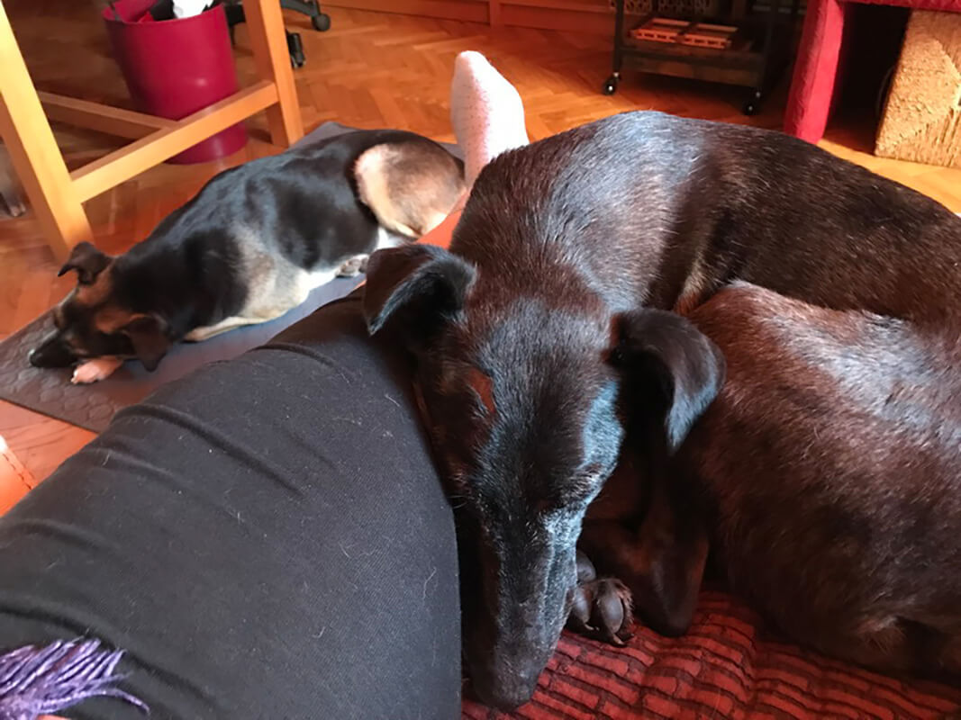 ah ja : ich hab auch einen neuen namen bekommen, der mir supergut gefällt : FOXI ! zu unserem ersten monatstag hatten mama und ich dann ein "ernstes gespräch" und uns wurde klar, daß wir uns NIE.NIE.NIE mehr trennen möchten. alle sind so lieb zu mir und glauben, ich sei ein junger hund, weil ich so lebensfroh durch den park spaziere, mama wundert sich auch immer, wenn ich wie eine gämse einen parcourt durch die wohnung laufe, klettere, hüpfe. ok, lola findet das nicht so toll, sie verkrümelt sich dann immer. obwohl sie 3 jahre jünger ist als ich, ist sie viel "erwachsener" und schrecklich vernünftig. aber das macht nix, wenn wir dann beide müde sind, können wir auch stundenlang nebeneinander chillen und ich träume, eingerollt wie eine zimtschnecke von all den erlebten abenteuern. meist krault mich mama dann in den tiefschlaf und, was soll ich euch sagen : es ist toll, teil dieses rudels zu sein - endlich ist das leben wirklich schön !