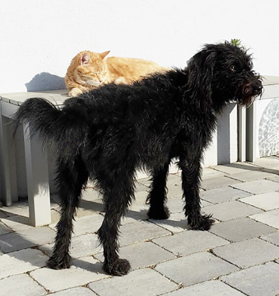 Mit meinem Kater Bruno (15 Jahre alt) verträgt er sich super und die beiden bleiben sich nix schuldig. Er hält den alten Herrn ganz schön auf Trab – ich hätte aber keine Sekunde Angst gehabt, dass der Henry dem Bruno etwas tut – eher umgekehrt.