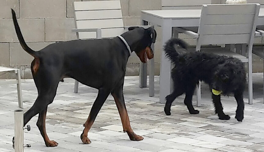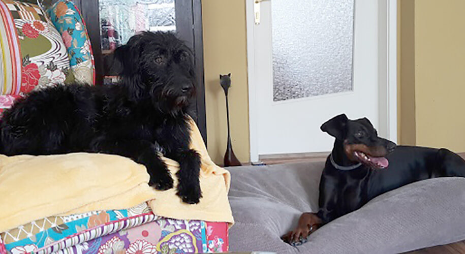 Er geht jeden Tag mit mir ins Büro und liegt die meiste Zeit ganz entspannt in seiner Box unter meinem Schreibtisch. Henry ist seit kurzem großer Bruder – meine Kollegin hat einen 7 Monate alten Welpen (AM-Staff/Retriever-Mischling Bonnie). Die liebt ihn wie verrückt und geht ihm welpenmäßig auf den Geist – erträgt er aber mit einer Ruhe die mich oft staunen läßt – ganz großer Bruder halt. Mit der zweiten Hündin im Büro (Bordercollie Joy) verträgt er sich auch bestens. In der Früh wird meist eine Runde durchs Büro geflitzt – abwechselnd immer ein anderer vorne und dann gemeinschaftlich gechillt.