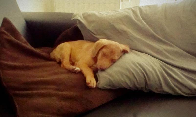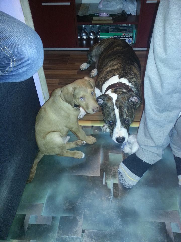 Anbei schicke ich dir mal die ersten Fotos von unserem kleinen Higgins und  seinem neuen Freund Justice. Er hat sich bei uns ganz schnell eingelebt und fühlt sich schon extrem  wohl. Schlafen tut er ganz viel, aber wenn wir unterwegs sind, dann geht er brav  an der Leine mit. Angst vor der Strasse...keine Spur! Gestern hat er uns nur  mehr 1 mal in die Wohnung gemacht, ansonsten meldet er sich, sobald er muss  sofort.