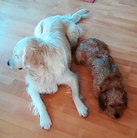 Wie Sie auf den Bildern sehen, ist sie mit zwei Hunden und einer Katze bestens zusammen gewachsen. Zwei Wochen nachdem Holly zu mir gekommen ist, habe ich einen Pflegehund bekommen (Frau ist leider verstorben). Wie die Lage heute ist, bleibt der Golden Retriever wahrscheinlich bei mir. Somit hat Holly eine große Hundeschwester bekommen. Die zwei lieben sich total.