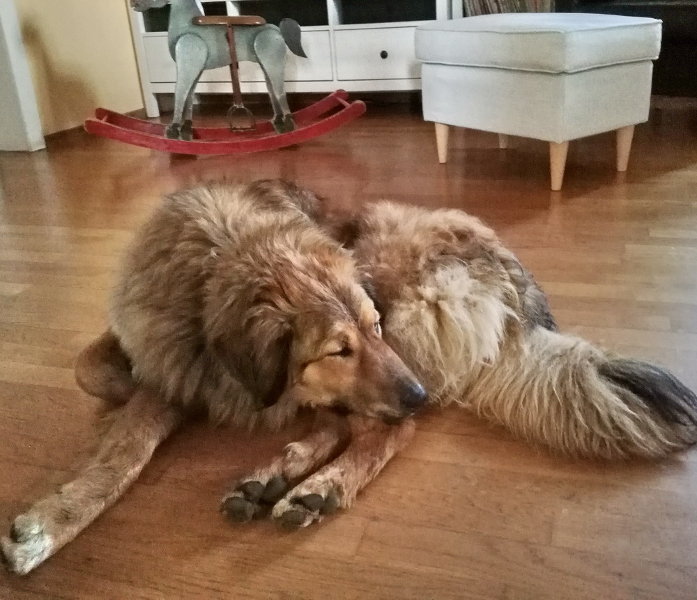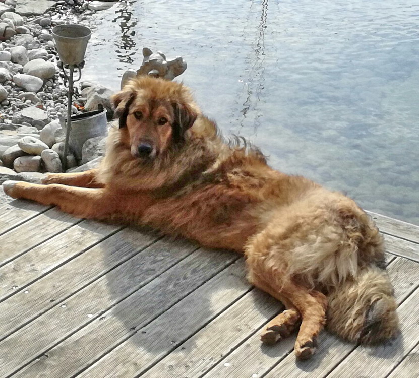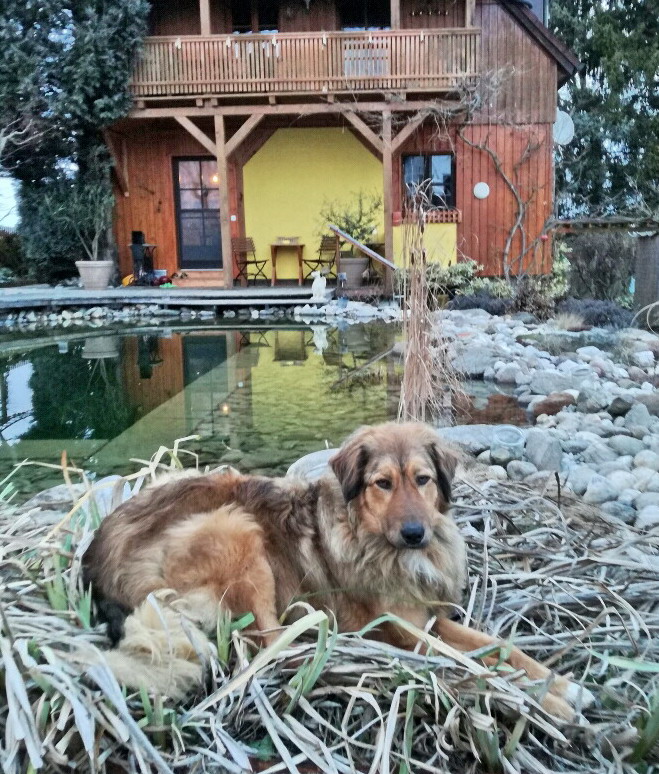 Auf den Fotos ist er liegend zu sehen, denn wenn Julio durch den Garten fegt, ist ein Foto zu machen, das scharf ist, unmöglich. 3-4 mal täglich sind wir mit ihm spazieren und es gibt ja so viel zu NEUES zu entdecken. Julios Lieblingsplatz ist an unserem Teich, aus dem er sehr gerne trinkt. Auf dem Foto, wo unser Haus auch zu sehen ist, "half" er mir bei der Gartenarbeit, indem er sich auf die abgestorbenen Blätter der Schwertlilien legte, die ich gerade abschneiden wollte. Julio ist immer mit dabei, im Haus, im Keller, im Garten!