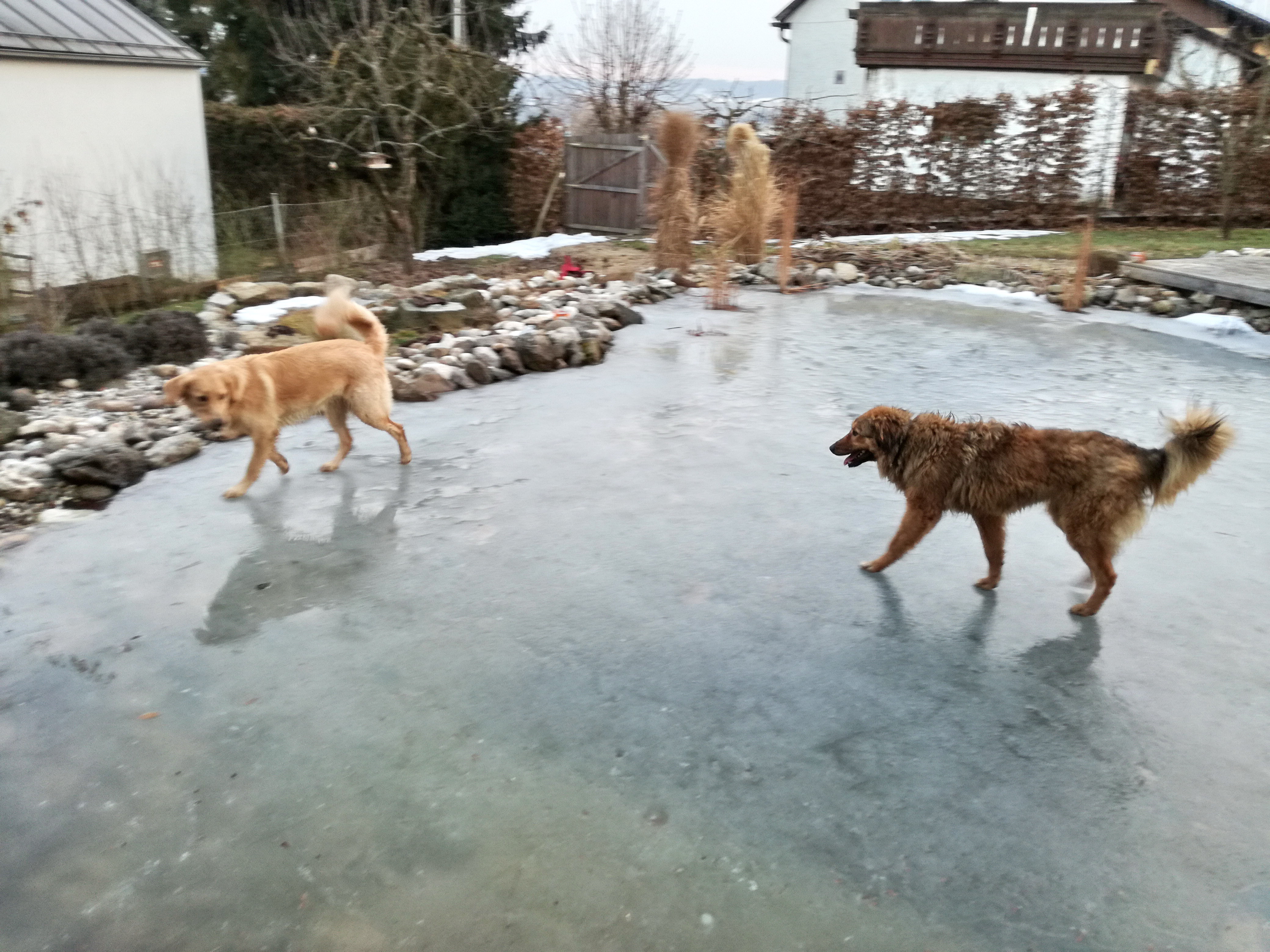 Auf dem einen Foto sieht man Julio mit Nachbarshündin Gina in unserem oberen Garten vor dem Haus. (wir haben unterm Haus auch noch einen Garten)
