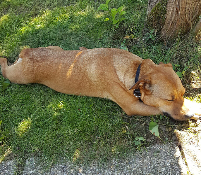 Bei unseren täglichen Waldspaziergang blüht Karma richtig auf. Sie geniesst es, sehr im ruhigen kühlen Wald spazieren zu gehen. Dort ist ihre Angst wie weggeblasen. Und nachdem wir an der 5m Leine das Herkommen geübt haben, kann sie dort bereits ohne Leine mitlaufen. Wenn Menschen kommen oder Sie etwas beunruhig,t haben wir gelernt, dass sie hinter mich kommt, was Sie sehr schnell gelernt hat.