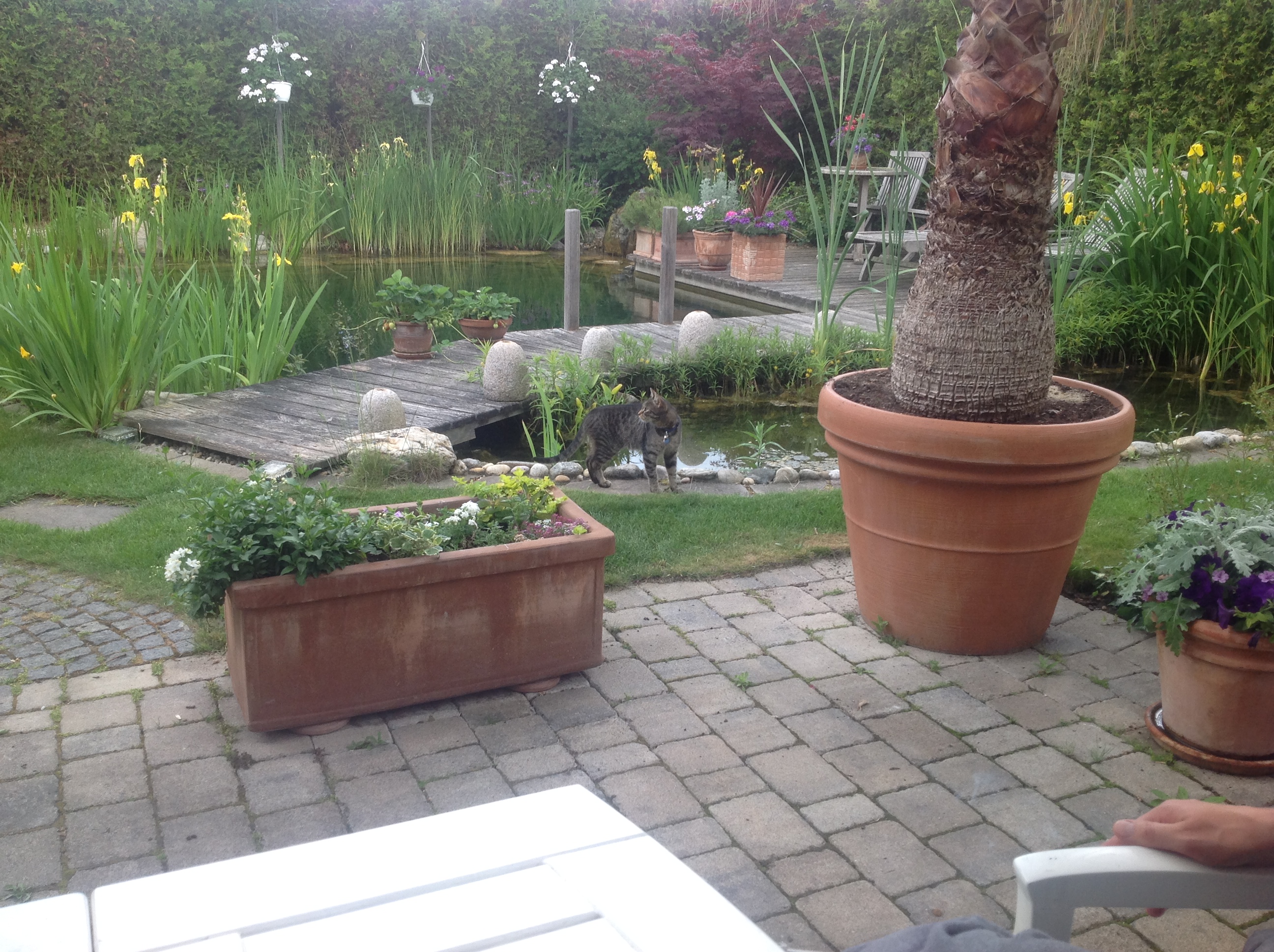 da wir ja seeehr ruhig wohnen, geht er auch schon raus, kommt immer brav zurück, wird mit einer krabbe belohnt und ist besonders fasziniert von unseren beiden grossen alten fischen im teich!