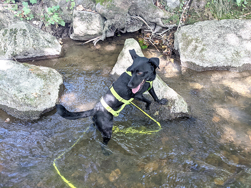 Wir haben auch schon die erste kleine Reise hinter uns und haben meine Eltern am Land besucht. Dort ist sie richtig aufgeblüht und voller Freude durch den Wald und über die Wiesen gelaufen und in den Fluss gesprungen. Dem vielen Wasser im Fluss stand sie am Anfang zwar noch eher skeptisch gegenüber, dieses hat sie aber jeden Tag mehr und mehr zu schätzen gelernt.