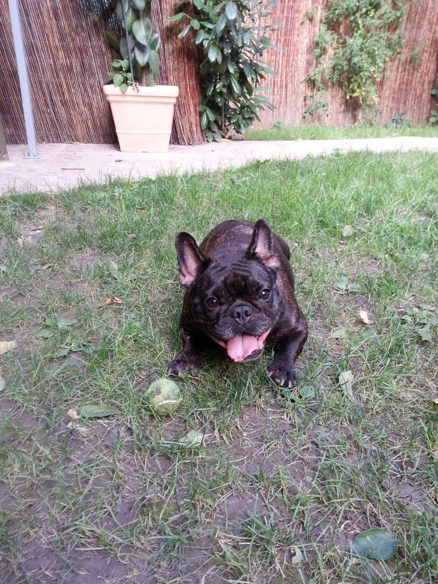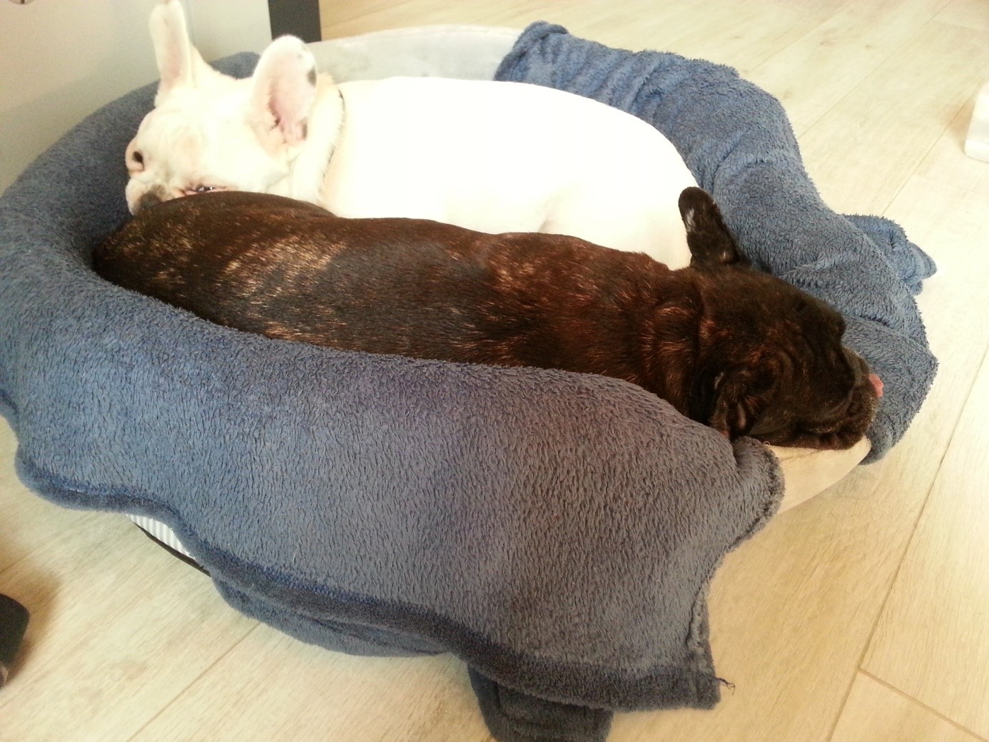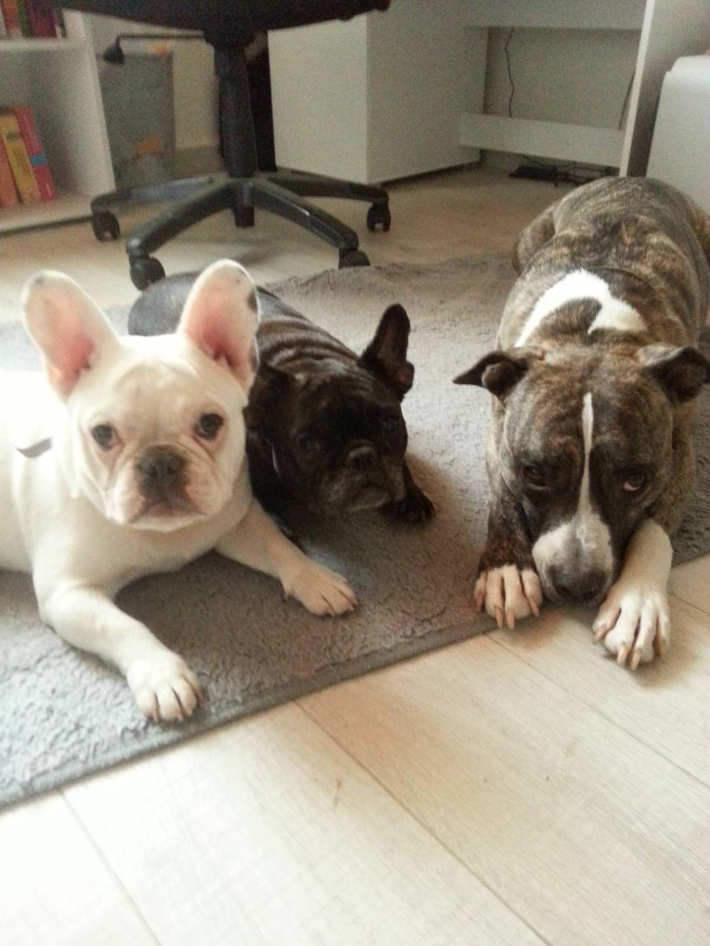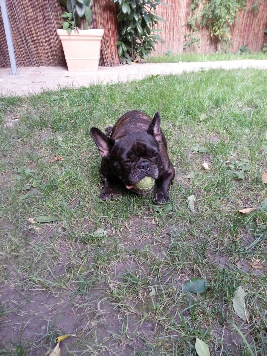Immer lauter wurde das Schmatzen beim täglichen Fressen und auch die tierische Gesellschaft meiner 2 Burschen gefiel ihr immer mehr – jedes Spielzeug wurde geteilt und auch jedes Hundebett :) (siehe Foto). Vor allem mein kleiner Oskar, der auch eine Französische Bulldogge ist, versuchte tagtäglich sein Glück und rannte mit jeglichem Spielzeug immer wieder zu Lilly um sie zum Spielen aufzufordern und siehe da – nach ein paar Tagen, sind die beiden gar nicht mehr zu halten. Und auch Spike, mein American Stafford Terrier, genießt Lilly’s Gesellschaft sehr, vor allem bei einem gemeinsamen Mittagsschläfchen auf dem Sofa. Die erste Zeit war unser Garten eine große Hilfe, da Lilly absolut nicht mit uns Spazierengehen wollte. Dort entdeckte sie ihre große Leidenschaft: das Ballspielen und Wälzen in der Wiese :)