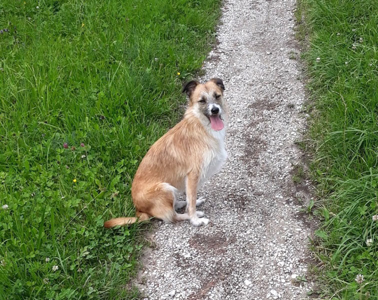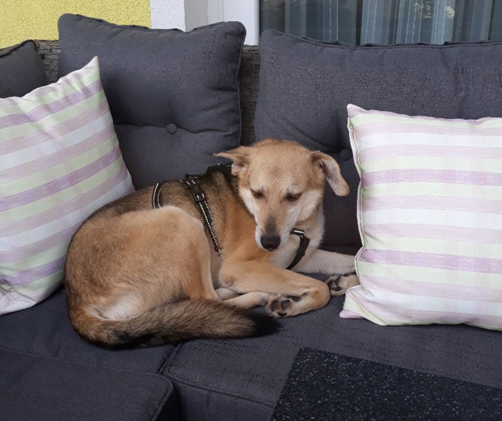 Hope fühlt sich bei meinen Eltern sichtlich wohl, er liegt ganz entspannt auf der Terasse, lässt sich streicheln und chillt.