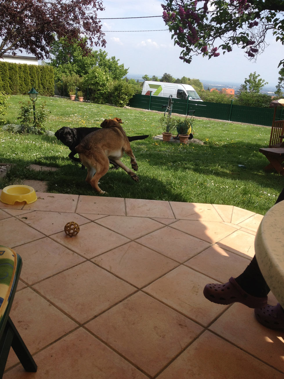 es ist erst eine Woche her, dass wir nach Ungarn gefahren sind und Lizzi zu uns genommen haben. Lizzi ist so wie von Ihnen beschrieben, ein liebevoller, gutmütiger und charaktervoller Hund. Wir sind sehr froh, dass wir uns für sie entschieden haben. Lizzi hat sich sehr gut bei uns eingelebt und wir können unseren Kater uns sie schon gemeinsam frei laufen lassen.  In der Labradorhündin Bijou, die im gleichen Alter ist wie Lizzi, hat sie auch schon eine Freundin gefunden. Anbei sende ich Ihnen ein paar Fotos der letzten Woche.