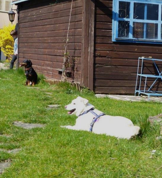Direkt an der Gartentür führt der Weg zu einem kleinen Waldstück, wo das Spazierengehen eine wahre Freude ist und es viele nette Hundekameraden gibt.