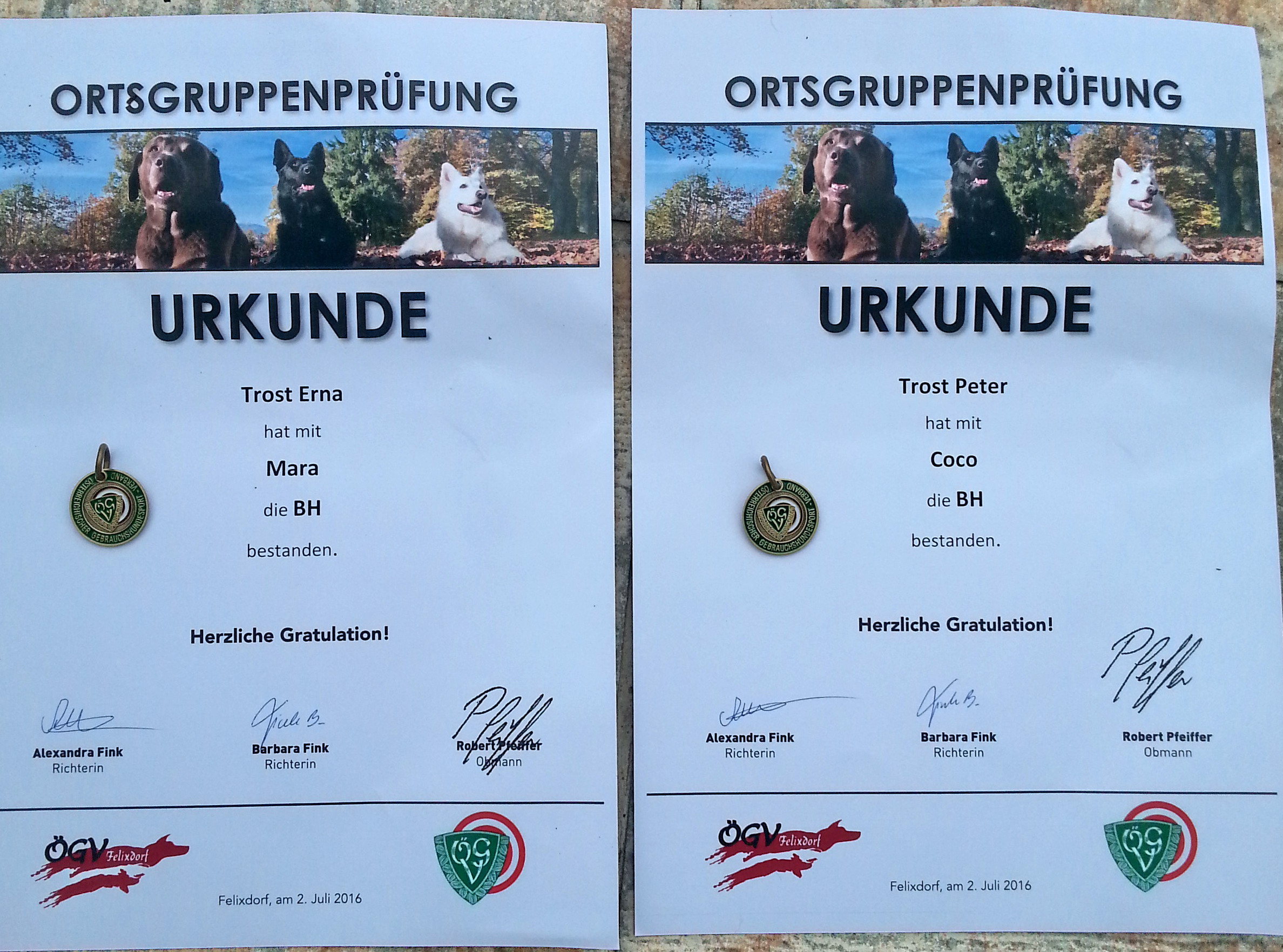 den Hunden geht es prächtig. Wir haben einen Unterordnungskurs mit den beiden besucht. Im Anhang sehen Sie Bilder mit den Urkunden der bestandenen BH-Prüfung der beiden.