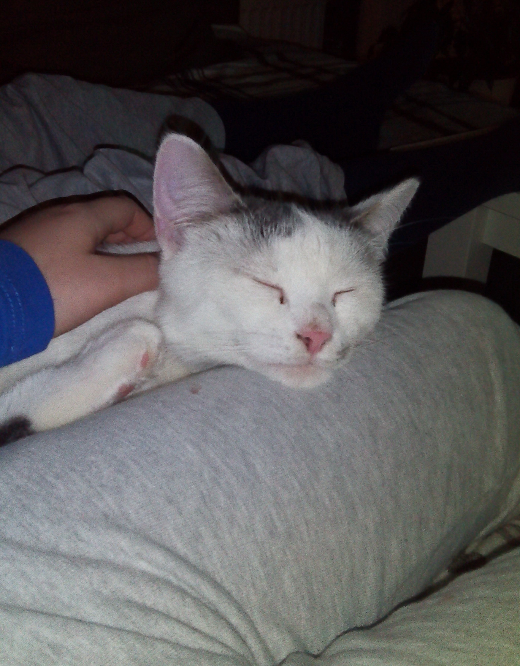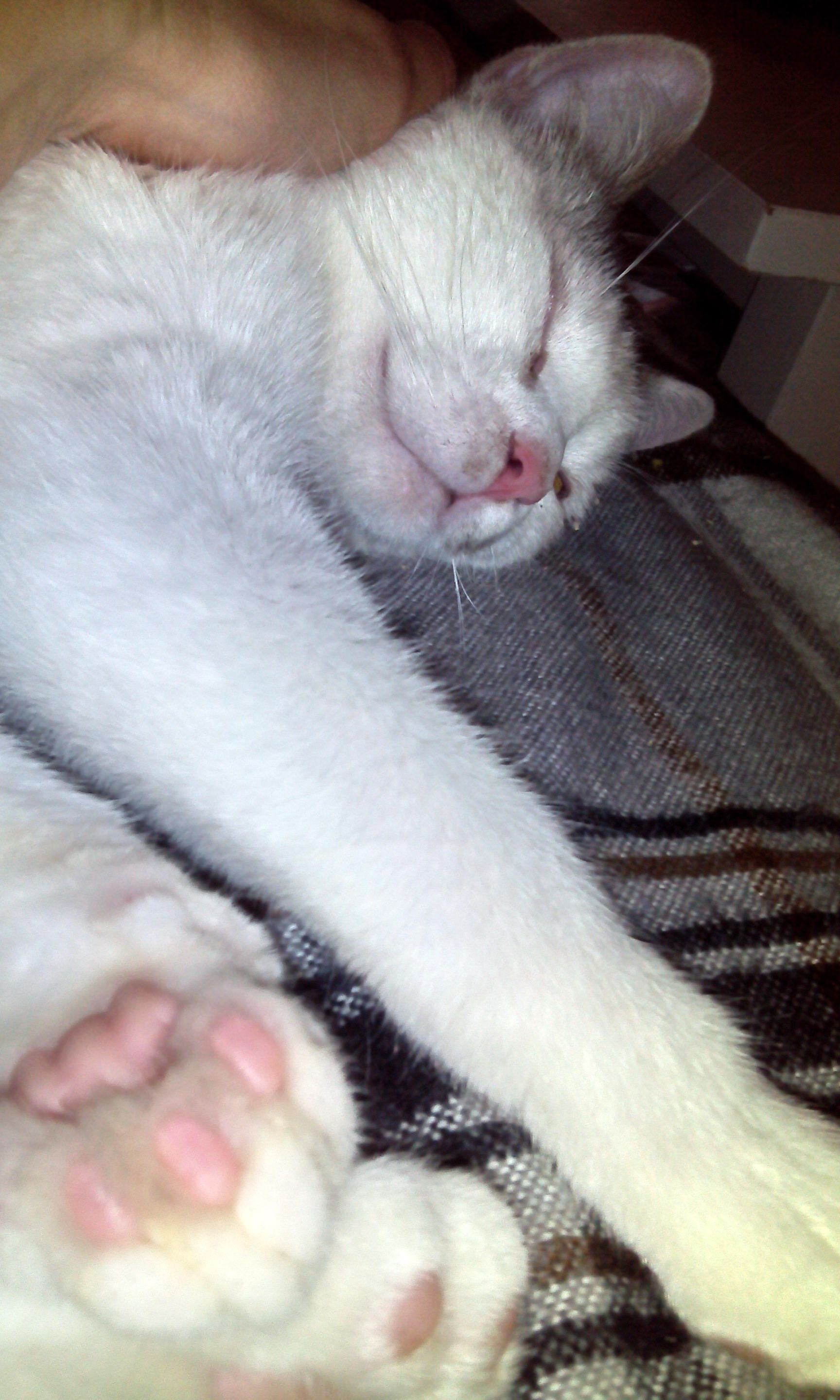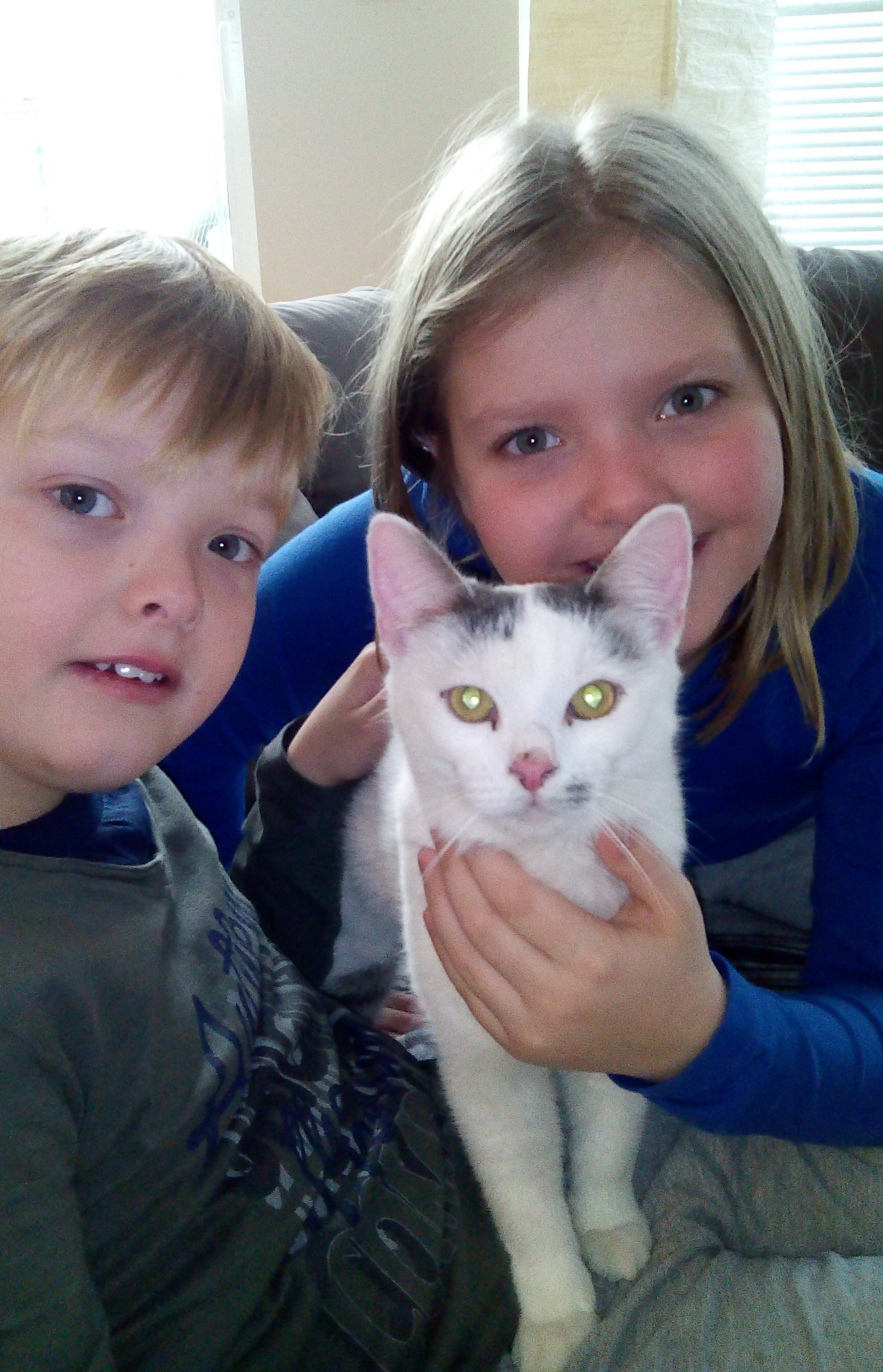 Es geht ihm gut, er hat gestern Abend noch ein Schälchen gefressen und sein neues zuhause neugierig erkundet. Langsam kommt er schon immer öfter zu uns, sucht die Nähe, will am Schoß sitzen und gestreichelt werden. Mit den Zwillingen spielt er schon und alle drei haben ihre rechte Freude daran :-) Er hat sich heute im Laufe des Tages sichtlich entspannt und schmust und schnurrt ohne Ende. Die Kinder waren schon besorgt ob er nicht heiser werden würde- vom vielen Schnurren ;-) Er hat einen guten Appetit und benützt problemlos sein Katzenklo.