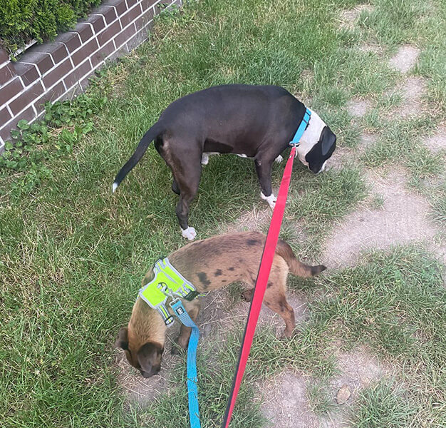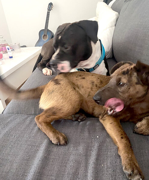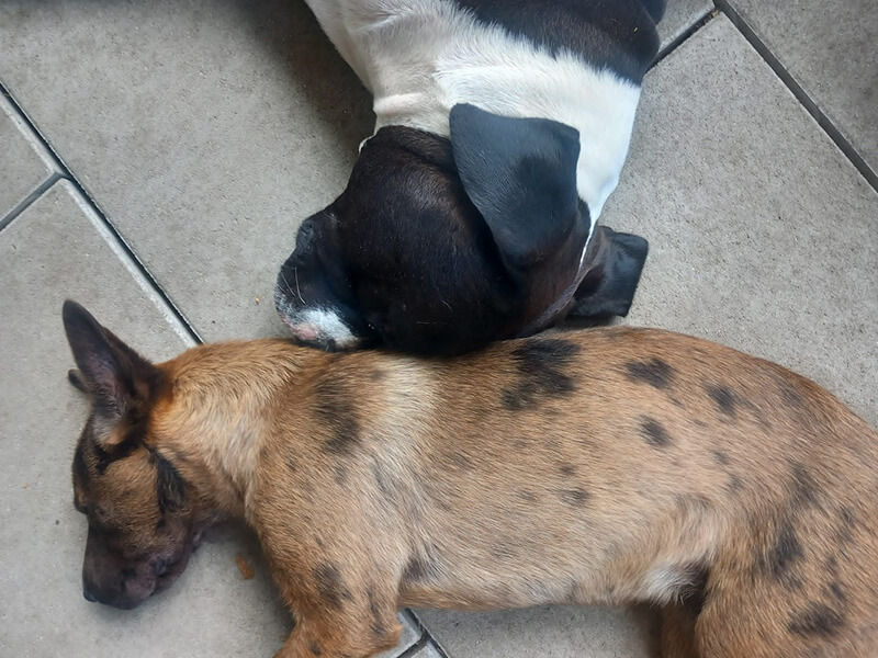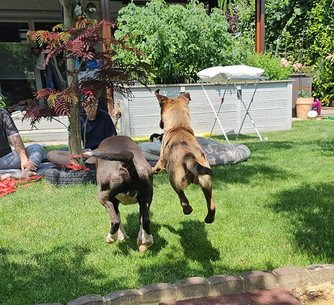 Merla geht es super, sie hat sich ganz toll eingelebt, sie liebt unseren ersten Hund total, die zwei sind ein Herz und eine Seele zusammen.