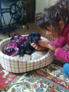 "Ihren" Garten hat sie schon zur Hälfte ausgiebig inspiziert und sich auch schon als Gärtner betätigt. Erde auflockern und Sträucher beginnen in Form zu beissen. Leine gehen klappt schon ganz gut, und sie bemüht sich stubenrein zu werden, das ist halt sehr schwer und dauert noch ein bisschen. Sie erlernt auch schon die Funktion als "Wachhund", bellt wenn wer für sie noch nicht Bekannter an der Haustüre ist und Schwupps ist sie ganz mutig hinter mir.