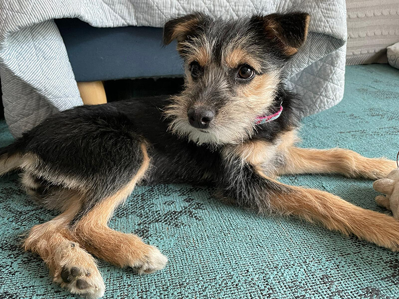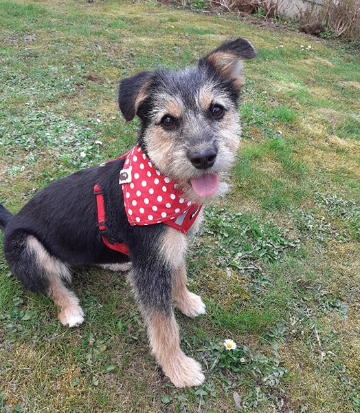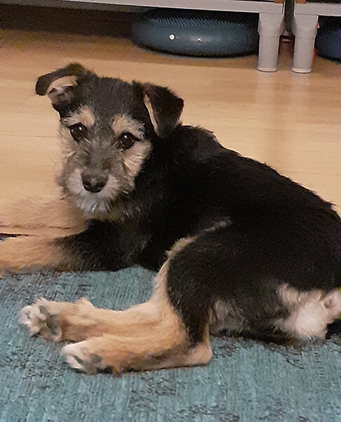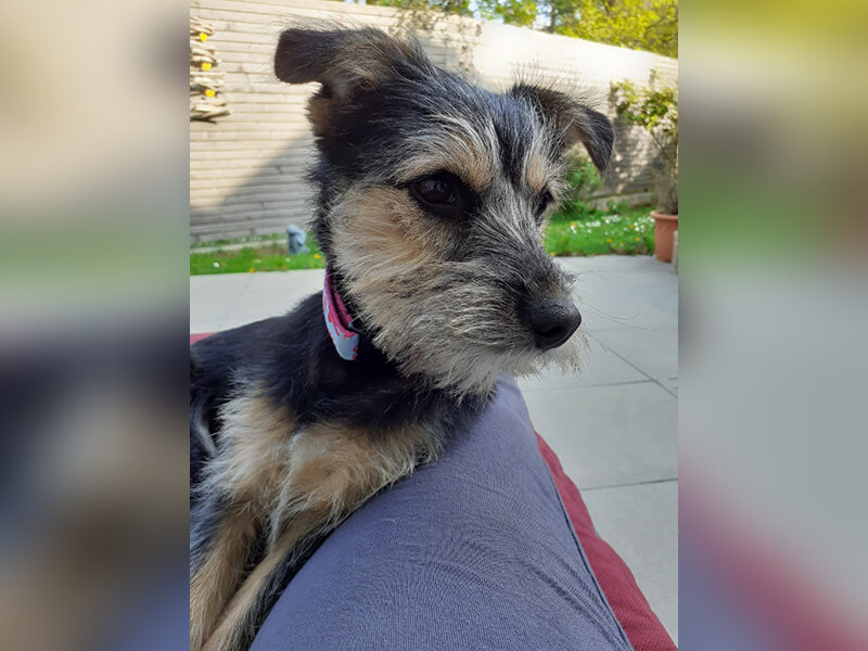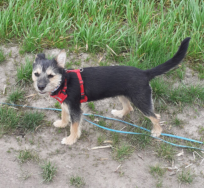 Sie geht an Bürotagen mit mir mit und ist ein beliebter Bürohund. Minnie kann schon Tricks wie Slalom, Liegen, Rolle, sie folgt meistens sehr brav und wir üben täglich den Freilauf und Rückruf.