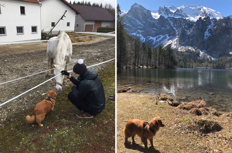 Unsere kleine Maus geht offen und freudig auf Mensch und Tier zu, sie hat sogar schon unsere Pferde in Oberösterreich kennengelernt, aber auch mit Kühen, Ziegen, Hennen und Katzen hat sie kein Problem.