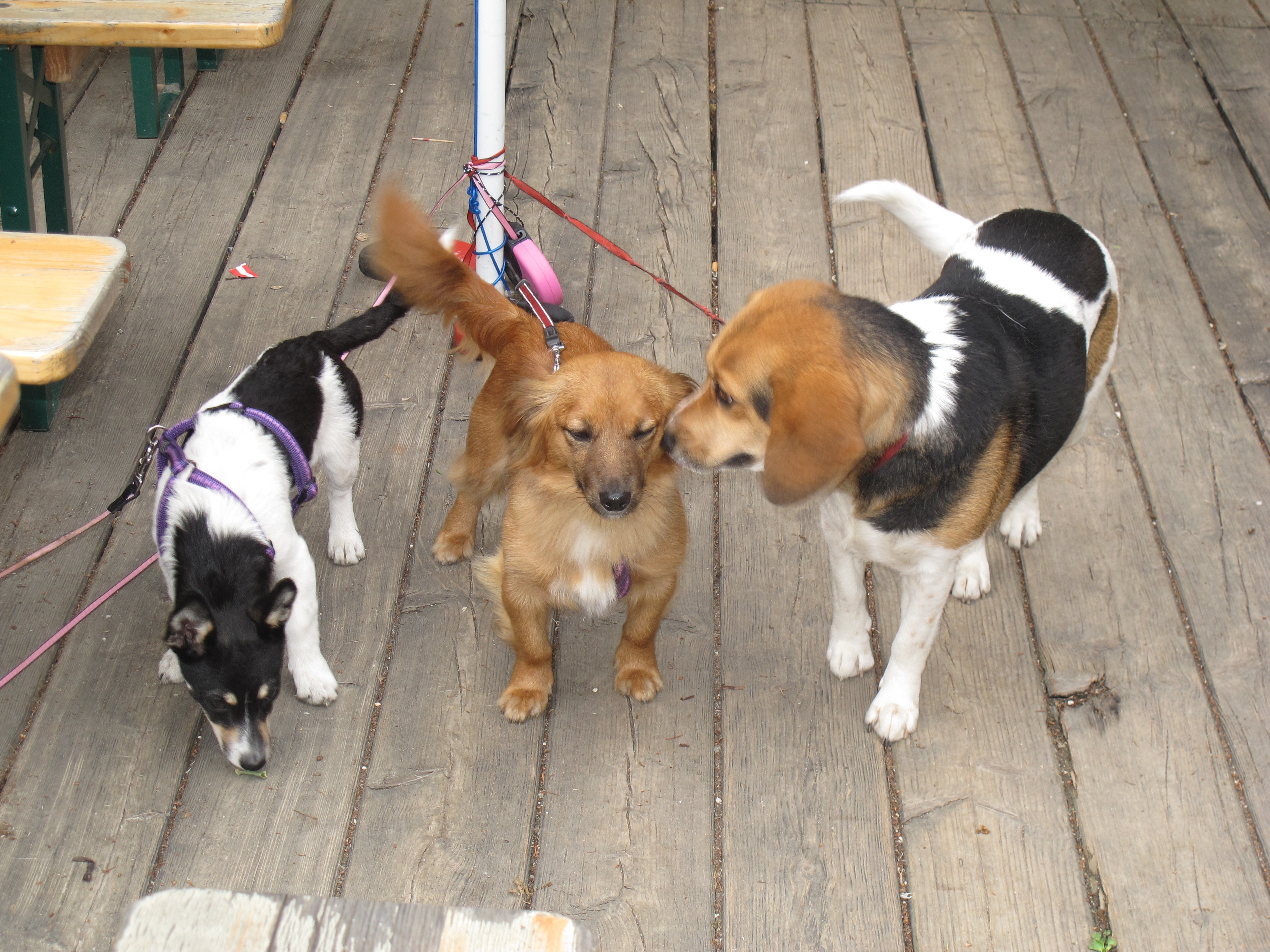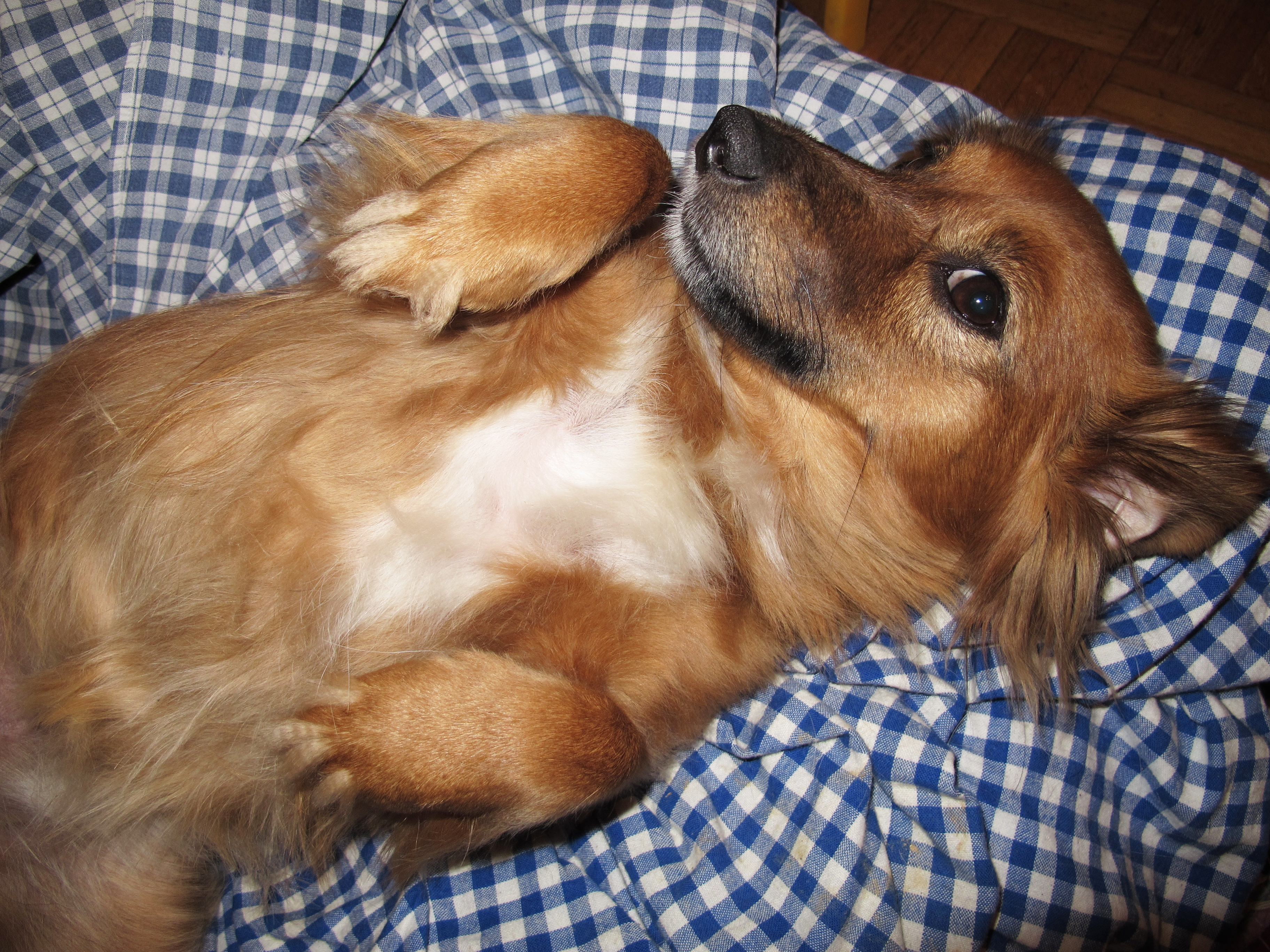 Meine Tochter ist mit ihrer Familie in ein eigenes Haus gezogen, sie kommen aber oft zu mir, auch ihr Hund, der sich jedesmal sehr freut hier zu sein. Nelly und Penny verstehen sich gut, sie toben oft gemeinsam durch den Garten. Wenn einer hinausgeht, wartet er meist auf der Terrasse, bis der zweite auch kommt. In der Wohnung verhalten sich beide sehr ruhig und brav. Nelly liegt in ihrem Bettchen oder bei mir im Bett, wo sie es dann sehr genießt, von mir beschmust zu werden. Bei Spaziergängen darf sie auch schon öfters freilaufen, was sie sehr genießt, sie macht aber noch ziemlich große Bögen, kommt aber immer bald zurück.Ich kann sie aber nur freilaufen lassen, wenn keine Hühner in der Nähe sind, denen rupft sie sonst leider die Federn aus. Sie hat schon einen ziemlichen Jagdtrieb. Da muss ich halt aufpassen. Derzeit liegt sie neben mir auf der Bank. Ich bin sehr glücklich, dass ich dieses süße Hündchen bekommen habe und danke Ihnen nochmals dafür. Sie macht mein Leben reicher und ich glaube, Nelly ist auch glücklich, bei mir sein zu können.