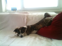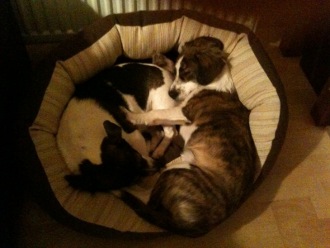Der Tag beginnt mit einer ausgiebigen Gesichtswäsche und einer Kuscheleinheit, wo man fast nicht mehr erkennen kann, ob sich da ein oder zwei Hunde über die Couch wutzeln.