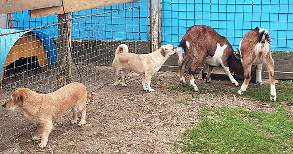 Die nächsten Tage lernte er dann Haus und Hof kennen und bewies, dass er eine gewaltige Sprungkraft hat. Er übersprang mit einem Satz den Gartenzaun und landete im Ziegengehege (dahinter ist die hohe Mauer). Am Tag 4 hat er gezeigt, dass er auch gelehrig ist. Er hat eine Henne umgebracht, lautes Händeklatschen und ein scharfes Aus und Stop hat genügt. Er hat seine Fluchtdistanz eingenommen und ignoriert seither die Hühner.