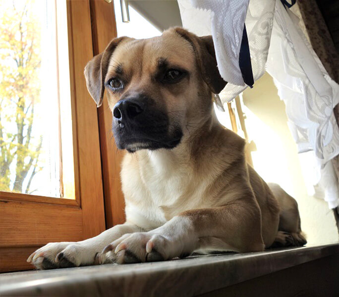 Ich nehme an er ist schon als Streuner geboren und kennt gar nichts anderes, als vor Menschen am besten zu flüchten. Er ist meiner Beobachtung nach nicht d e r Angsthund, der ständig mit eingekniffenem Schwanz zu flüchten versucht oder sich verkriecht. Er mag es einfach nicht, angefasst zu werden weil er damit schlechte Erfahrungen gemacht hat. Da kann es schon sein, dass er beim Fernsehen neben mir auf der Bank liegt, mit der Nasenspitze Kontakt macht, aber bei einer Berührung nur mit der Fingerspitze den Platz wechselt. Ansonsten ist er überall mit dabei, ist neugierig und aufgeweckt, bellt mich beim Ballwerfen auch schon mal ordentlich an. Spielen mit den anderen Hunden geht nur bedingt. Nils ist einfach zu wild beim spielen, er ist auch grösser als in der Beschreibung angegeben. Der alte Lenny versucht kurz mitzuhalten und bricht dann ab, Emma ist er zu groß und zu ungestüm.