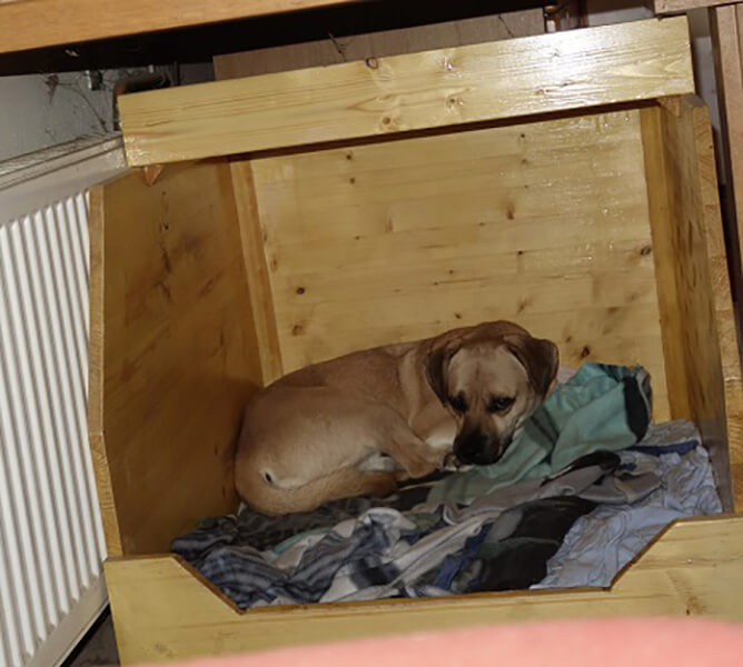 Beim Heimkommen am 22.9. lief es eigentlich optimal: Wir stellten die Transportbox in unsere Wohnküche und entfernten die Tür. Wir dachten, dass sie bis zur Eingewöhnung sein Schlafplatz sein würde. Weit gefehlt: er sprang heraus, drehte eine Runde in der Küche, sprang über die Bank auf das Fensterbrett und versuchte zu flüchten, was natürlich nicht ging. Er sprang dann unter den Küchentisch in die "Indoor-Hundehütte", die ihm zugedacht war, und blieb dort.