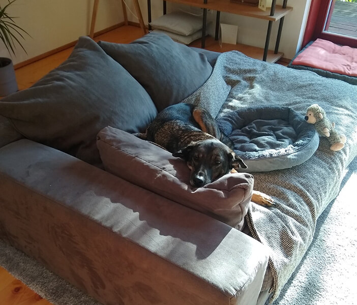 But in addition to needing medical treatment, Nori needed a home. So in November 2020, my dog Gaia and I met Nori at the animal clinic and brought her to our home. Poor Nori was beside herself with fear. Having only very limited experience with humans, she didn't trust them. She looked to Gaia for security and followed her around, but Gaia eventually lost patience with Nori on a few occasions letting her know in a not-very-friendly way that she wanted her space. I tried to provide Nori with love and security, but it was clear that my presence was too overwhelming for her in those early months and only caused Nori more fear and anxiety.