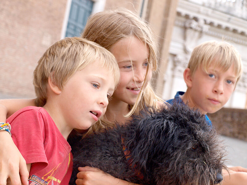 Mit all unseren 7 Kindern hat sie sich gut angefreundet, spielt begeistert mit den jüngsten Fangen und alle laufen durch Haus und Garten. Anfangs hatten wir den Eindruck, dass die beiden jüngeren Kinder, damals 2 und 4 Jahre, ihr etwas Stress machen, und sie schnelle Bewegungen nicht gut als gefährlich oder nicht gefährlich einstufen kann. Das hat sich nach den ersten Monaten gelegt, und gerade die beiden und Pari sind die dicksten Freunde geworden. Morgens radeln wir gemeinsam zum Kindergarten, Pari läuft nebenher und alle Kinder lieben sie.