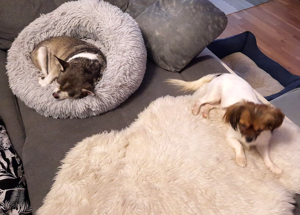Hat sich von der ersten Minute an wohl gefühlt im neuen Heim und schläft natürlich bei uns im Bett. Sie und ihr neuer Bruder waren schon am zweiten Tag ein Herz und eine Seele und spielen gemeinsam wie wir es schon lange nicht mehr bei unserem Nanuk gesehen haben!!