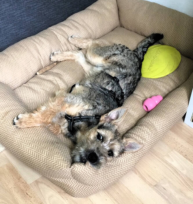 Pepi ist nun eine Woche bei uns und wir könnten glücklicher nicht sein. Er kann schon ein paar Kommandos wie Sitz und Platz und liebt sein neues Bettchen (das andere war ihm doch schon etwas zu eng). Seit gestern fängt er an, unsere Gassen zu erkunden und neugierig herumzuschnüffeln, also können wir zu unserer Überraschung schon kleine Spaziergänge machen, was sehr viel Spaß macht. Zudem macht er kaum in die Wohnung und macht sein Geschäft mittlerweile eigentlich immer draußen.