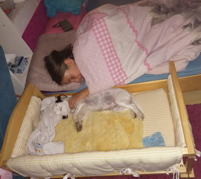 Wenn sie müde ist legt sie sich auf einen ihrer schlaf Plätze, aber am liebsten kuschelt sie sich zum schlafen zu uns...und wir lieben das😍.